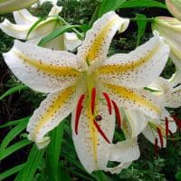 Лилия Ауратур, относящаяся к восточным гибридам, станет достойным украшением вашего сада. Эта шикарная уроженка Японии без труда освоилась в наших широтах, подарив садоводам возможность любоваться своей красотой ежедневно с июля до конца августа. Соцветия Ауратур просто огромные! На их молочно-белых подкрученных лепестках имеется разделительная лимонно-желтая полоса и светло-малиновые мазки разного размера. Необычной составляющей бутонов по праву можно назвать темно-коричневые пыльники, которые внешне так напоминают остренькие коготки кошки.