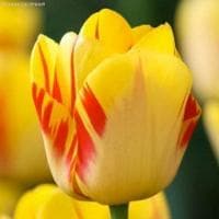 Тюльпан Олимпик Флейм, относящийся к группе Дарвиновых гибридов, числится в разряде любимчиков у многих садоводов. И все благодаря длительному цветению, ярким краскам и удивительному окрасу. Его крупные лепестки окрашены в ярко-желтый цвет, который разбавлен насыщенно-красными линиями.